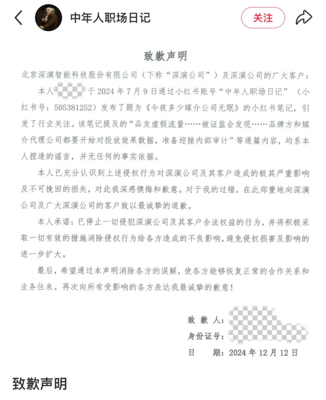 2024年7月上旬,我司关注到有自媒体发布并转载了针对我司的不实报道,编造谣言,严重损害了我司的声誉和利益。我司立刻与所有涉事媒体交涉,并发送律师函。 在所有涉事媒体删除造谣报道之后,我司还采取了进一步法律行动以肃清舆论,包括针对传播量大、负面影响最广泛的小红书账号“中年人职场日记”,我司依法提起诉讼。经过5个月的诉讼过程,该账号注册用户张XX对造谣事实供认不讳,并对我司及合作客户公开道歉,消除其造谣行为对各方造成的影响。按照法院调解书确定的义务,道歉信在“中年人职场日记”账号置顶90天。