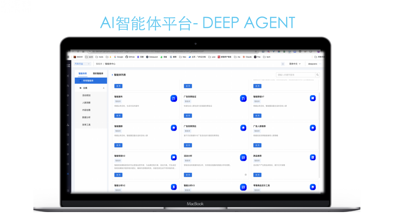 - 最后,依托深耕消费品、金融、汽车等领域十年的经验,Deep Agent 内置 300 多个行业决策模型与海量的场景化解决方案,为企业提供从数据治理到营销触达的一站式服务。